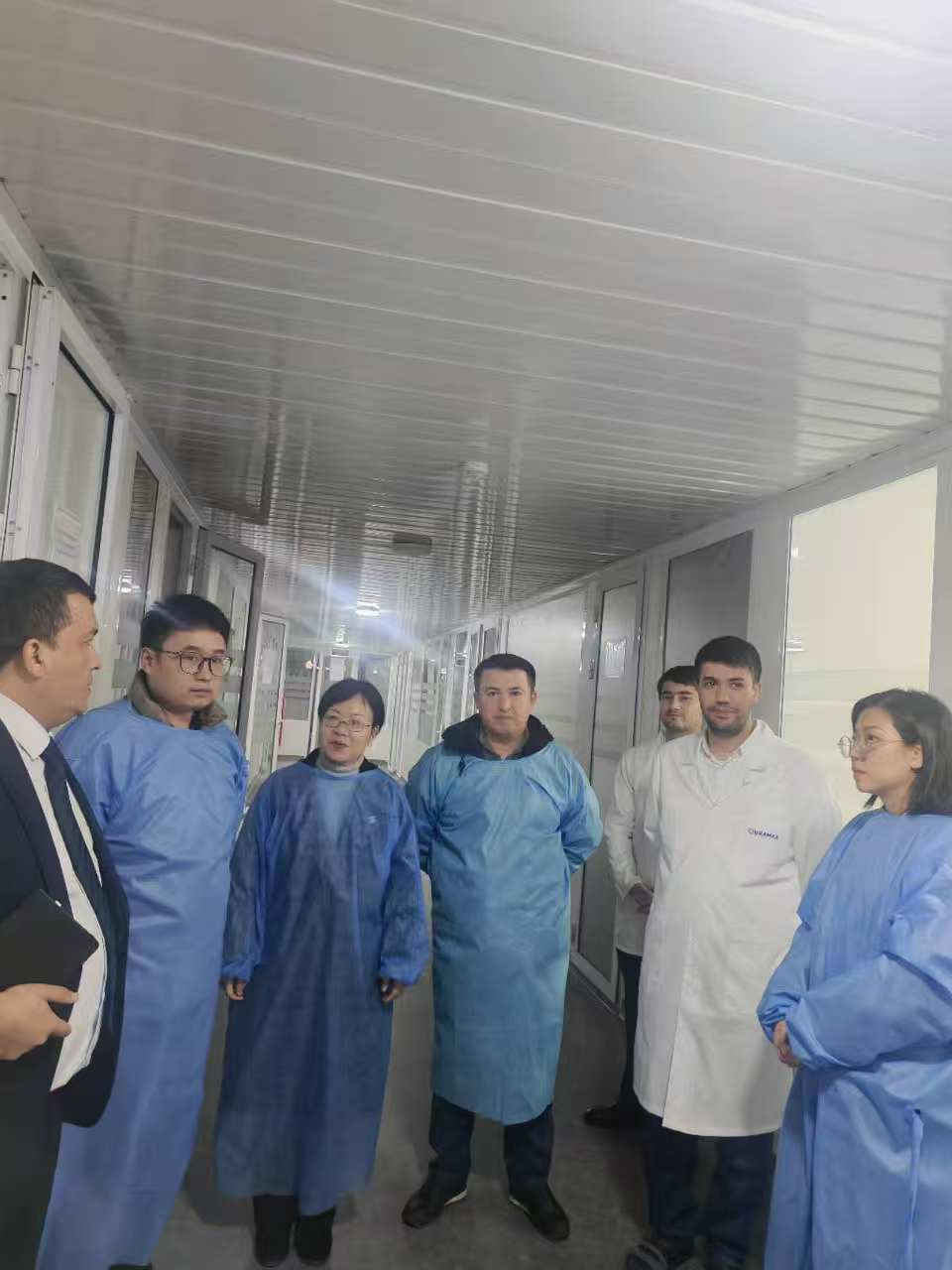 在乌米达·蒂拉耶娃副校长及国际交流处主任等领导的陪同下,访问团先后参观了该校生化分析实验室、模拟制药车间、现代药剂研发中心及成品包装生产线。在生化实验室,代表团重点考察了全自动生化分析仪、高效液相色谱-质谱联用系统等精密设备的运行管理模式;制药实验室中,师生现场观摩了固体制剂压片、外包装等工艺的标准化操作流程,对其智能化制剂生产线的连续化生产能力表示赞赏。药剂实验室负责人详细介绍了糖尿病制剂研发的建设情况,双方就制药系统的制备技术进行了专业探讨。